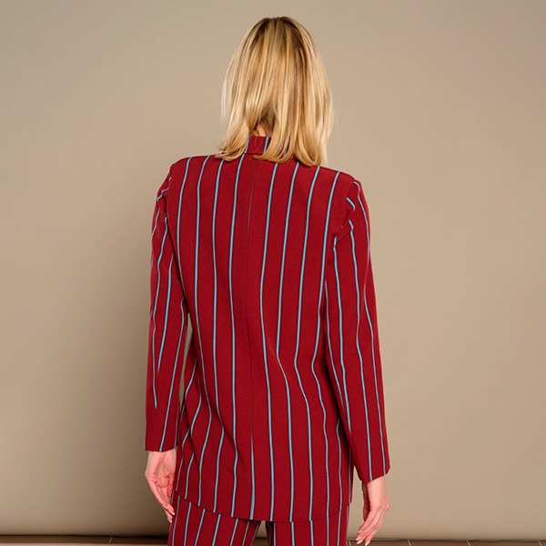 Esta chaqueta blazer con cierre delantero cruzado con doble botonadura y de corte recto entallado te va a encantar.Además un detallazo que nos encanta, bolsillos en el delantero con solapa y hombreras. Estampado de raya diplomática azul sobre burdeos perfecta para combinar con los pantalones de la colección.